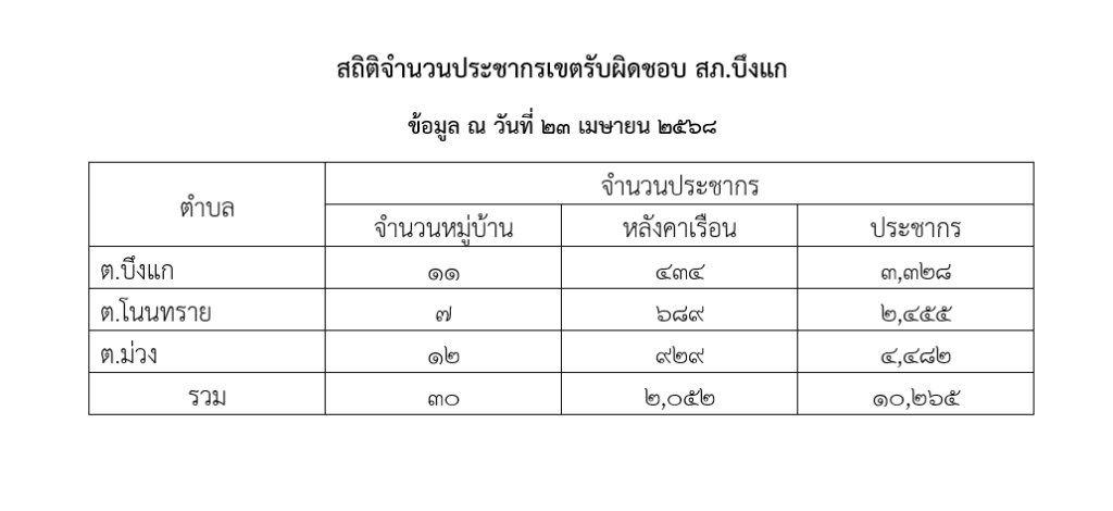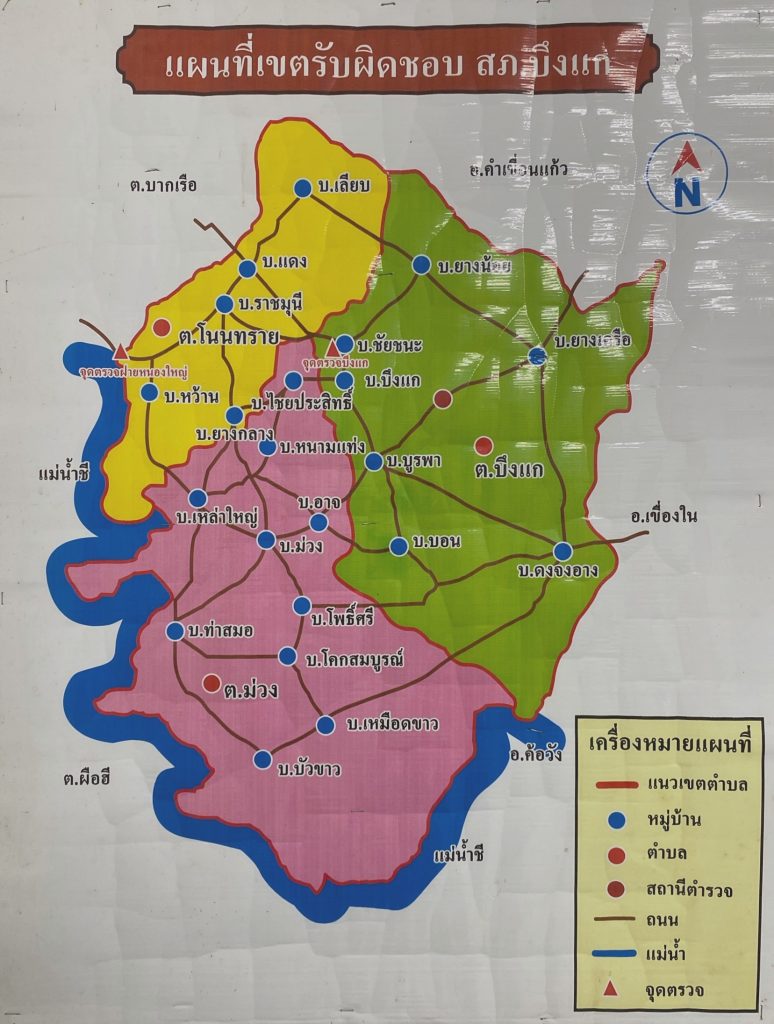 สถานีตำรวจภูธรบึงแก มีพื้นที่รับผิดชอบทั้งหมด 3 ตำบล ตามรายระเอียดนี้ ตำบลบึงแก มีพื้นที่ 53.69 ตารางกิโลเมตร ประมาณ 33,556 ไร่ ยส 2015 ตำบลโนนทราย มีพื้นที่ 23.66 ตารางกิโลเมตร ประมาณ 14,787 ไร่ ตำบลม่วง มีพื้นที่ 43.3 ตารางกิโลเมตร ประมาณ 28,497 ไร่ ทิศเหนือ ติดต่อกับตำบลบากเรือ เขตอำเภอมหาชนะชัย ทิศใต้ ติดกับอำเภอค้อวัง และอำเภอมหาชนะชัย จังหวัดยโสธร ทิศตะวันออก ติดกับอำเภอเขื่องใน จังหวัดอุบลราชธานี ทิศตะวันตก ติดต่อกับ เขตอำเภอมหาชนะชัย เขตการปกครอง แบ่งออกเป็น 30 หมู่บ้าน จำนวนประชากร รายได้เฉลี่ย 77,638.64 บาท/คน/ปี